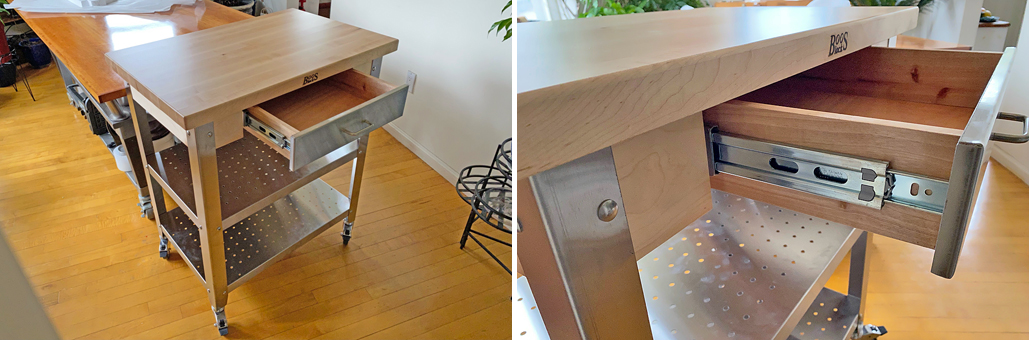 The Boos Cucina Elegante kitchen cart has been an elegant and useful addition to the RainyDayKitchen. We worked it hard almost every day this past year. The cart did everything we asked of it, took all that we threw at it, and it still looks as great as the first day we rolled it into the kitchen.