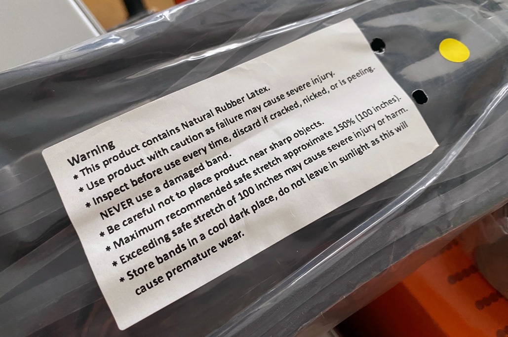 The bands are made of latex and are manufactured in Sri Lanka due to limited U.S. latex production. The bands are made using a 15-layer latex layering process for durability and strength, which helps prevent snapping if damaged.