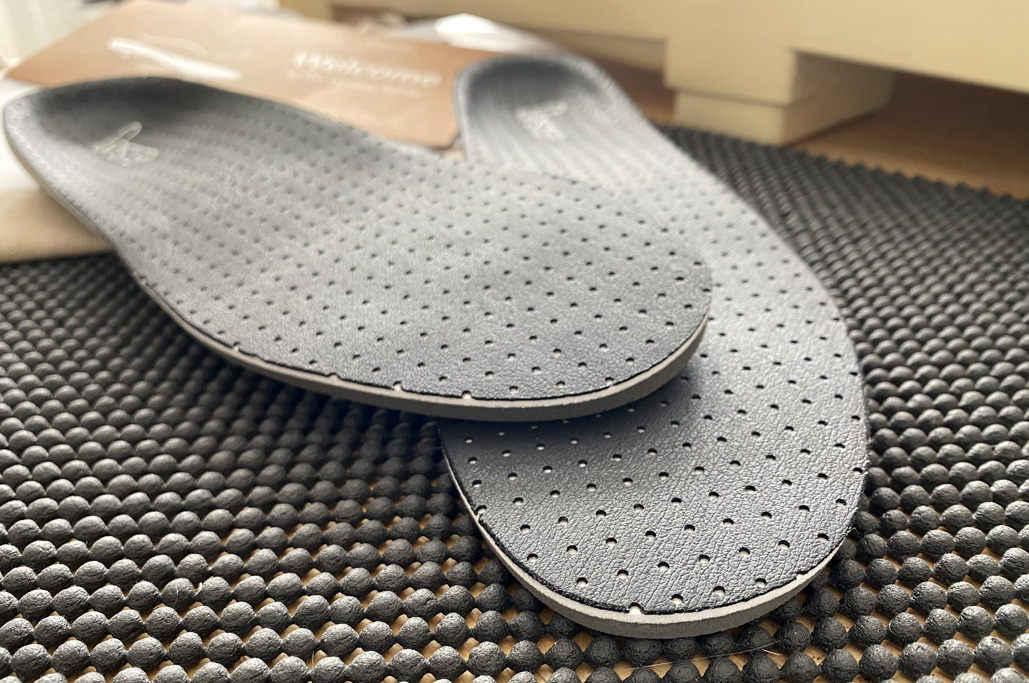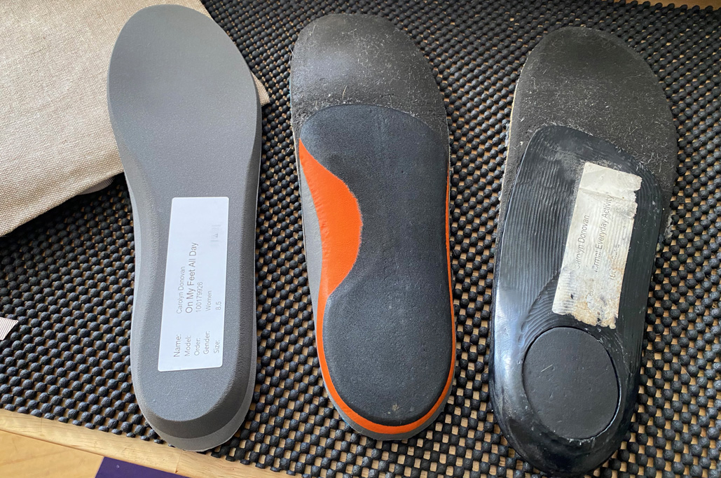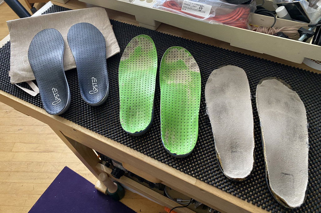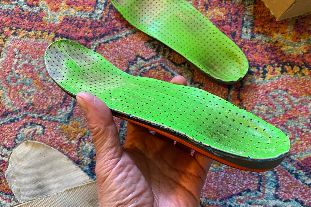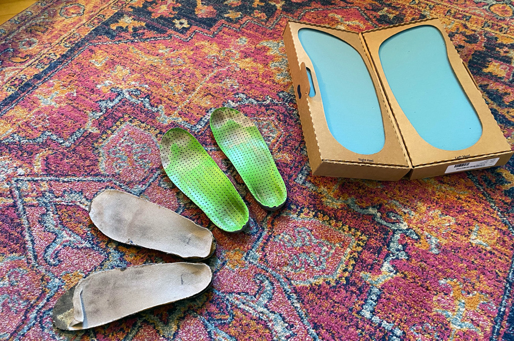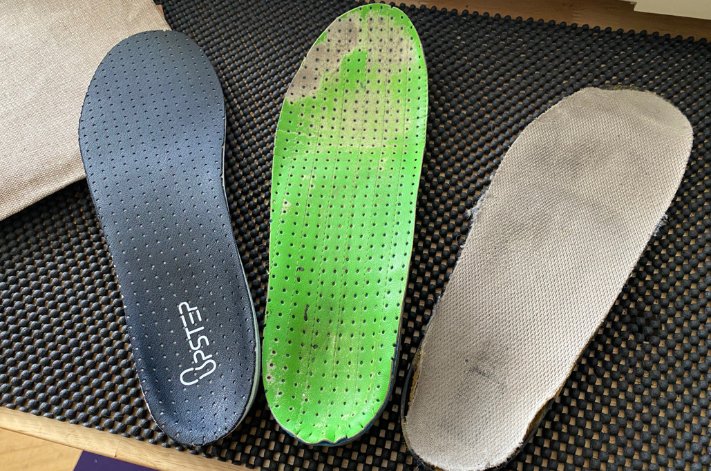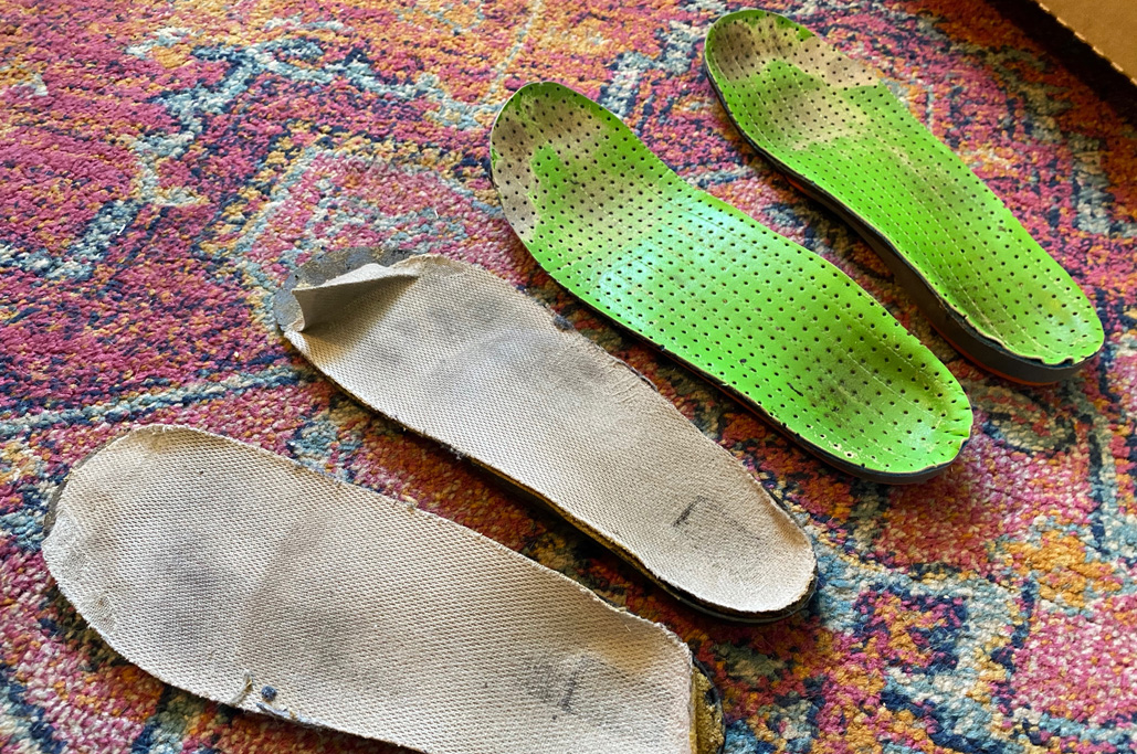 In 2019, we ordered two different styles of orthotics from Upsteps: one for everyday use (and everyday shoes) and the other for hiking, sports, and more active situations. Readers can see that both sets had been used extensively!