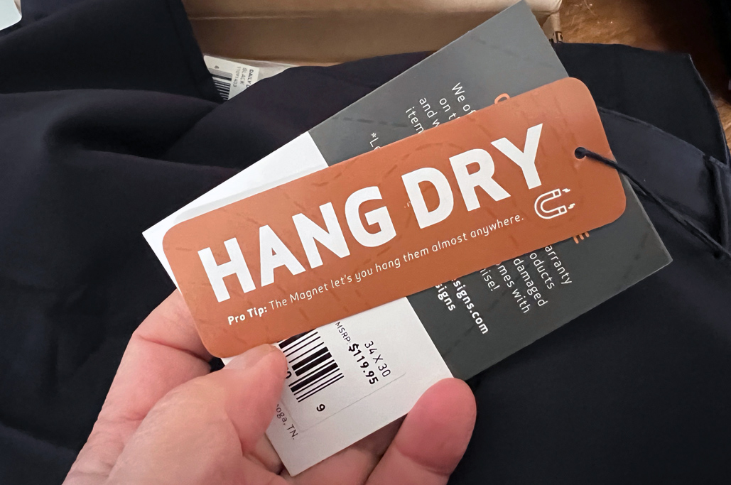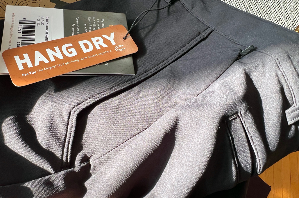Wash with any regular load, but these pants are HANG DRY ONLY, because the magnet could attach the pants to the dryer drum and potentially be ripped out. Fortunately, they’ll probably be dry before the time it takes to dry the load in the dryer. Steam to remove wrinkles if desired, but no iron.